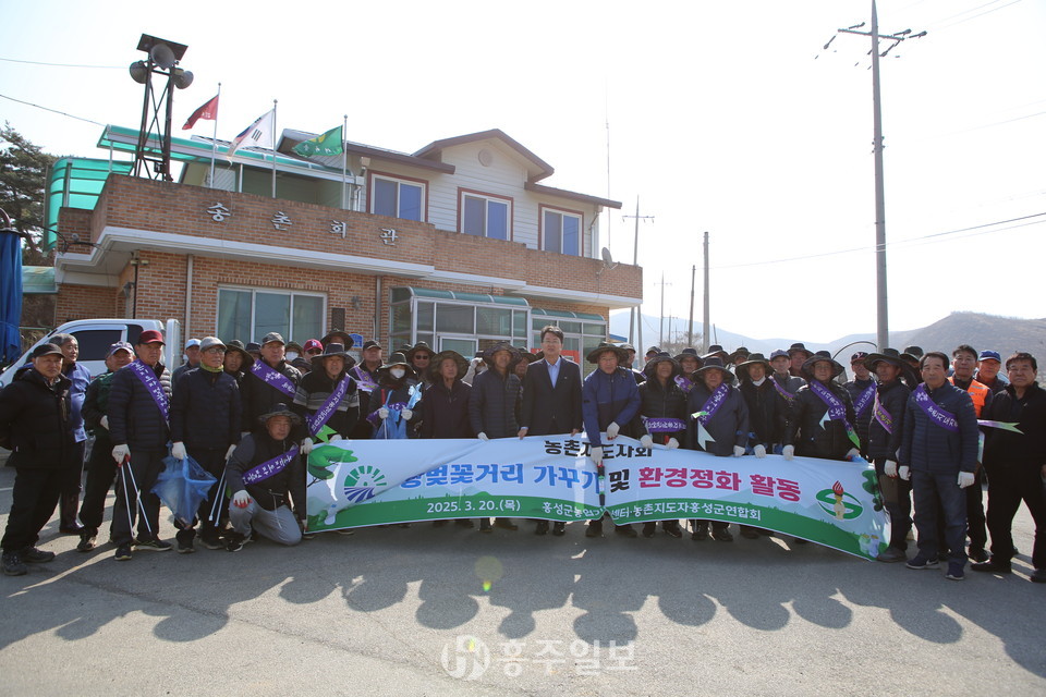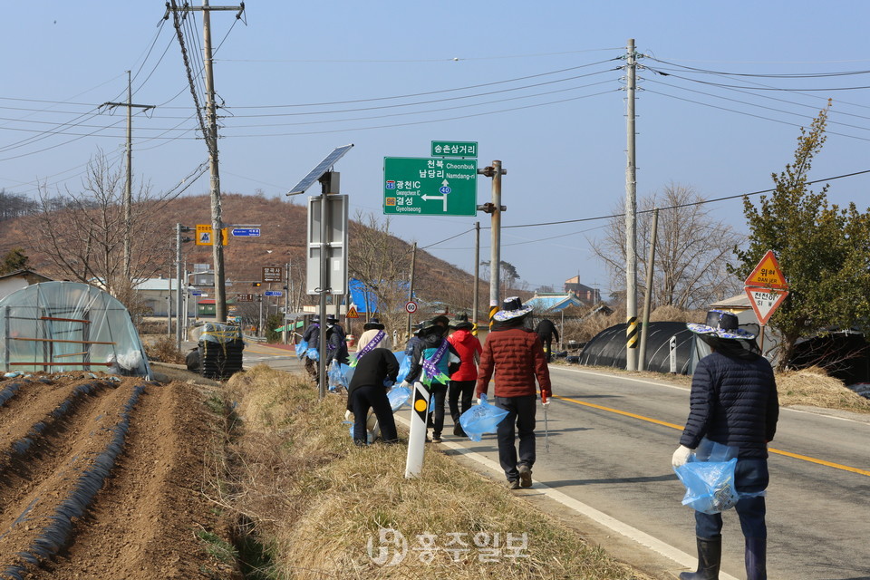 한국농촌지도자 홍성군연합회(회장 박복성)는 20일 65여 명의 회원이 참여한 가운데 서부면 송촌 마을부터 남당리 입구에 이르는 ‘왕벚꽃 거리’에서 도로변 가지치기와 쓰레기 줍기 등 환경정화 활동을 전개했다.<사진>