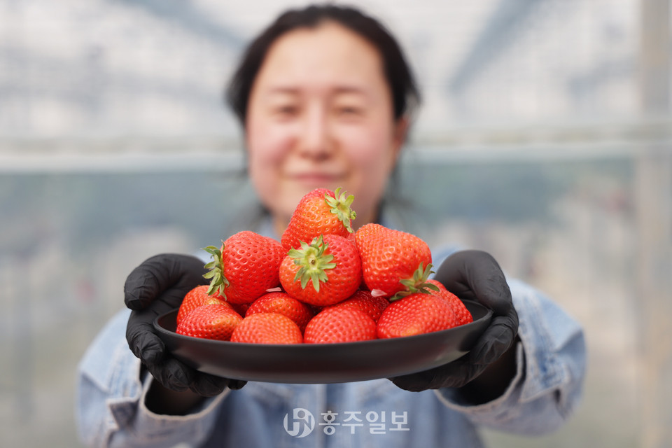 [홍주일보 홍성=글 한기원 기자/사진 오동연 기자] 홍성군 지역특화작목인 홍희딸기에 이어 대한민국 프리미엄 딸기 시장을 공략하기 위한 홍성군 개발 신품종 딸기인 ‘골드베리’의 품종설명회가 지난 25일 열렸다. 사진은 한 생산자가 홍성군에서만 재배되는 유일한 프리미엄 딸기 ‘골드베리’를 들어보이며 환하게 웃고 있는 모습.