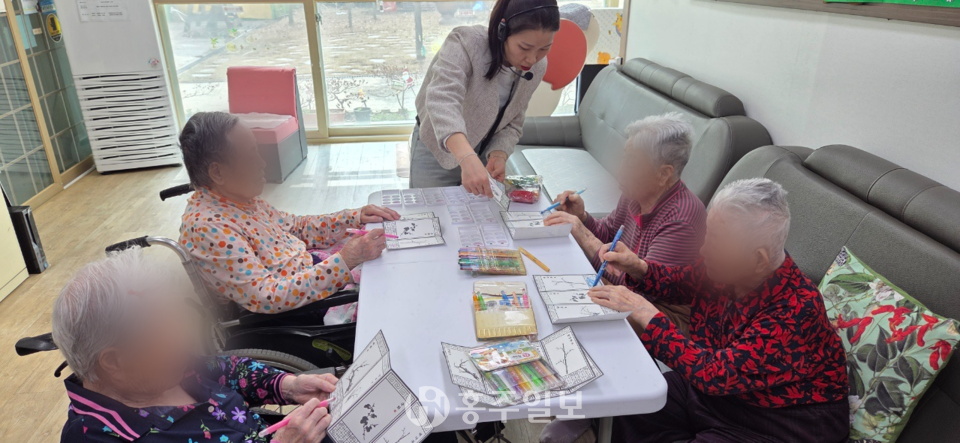 이날 ‘소망의 집’ 전달님 강사가 어르신 9명을 대상으로 ‘소원을 그리는 아이’ 그림책을 읽고 물감 찍기를 활용한 사군자 병풍 꾸미기 활동을 진행했다.
