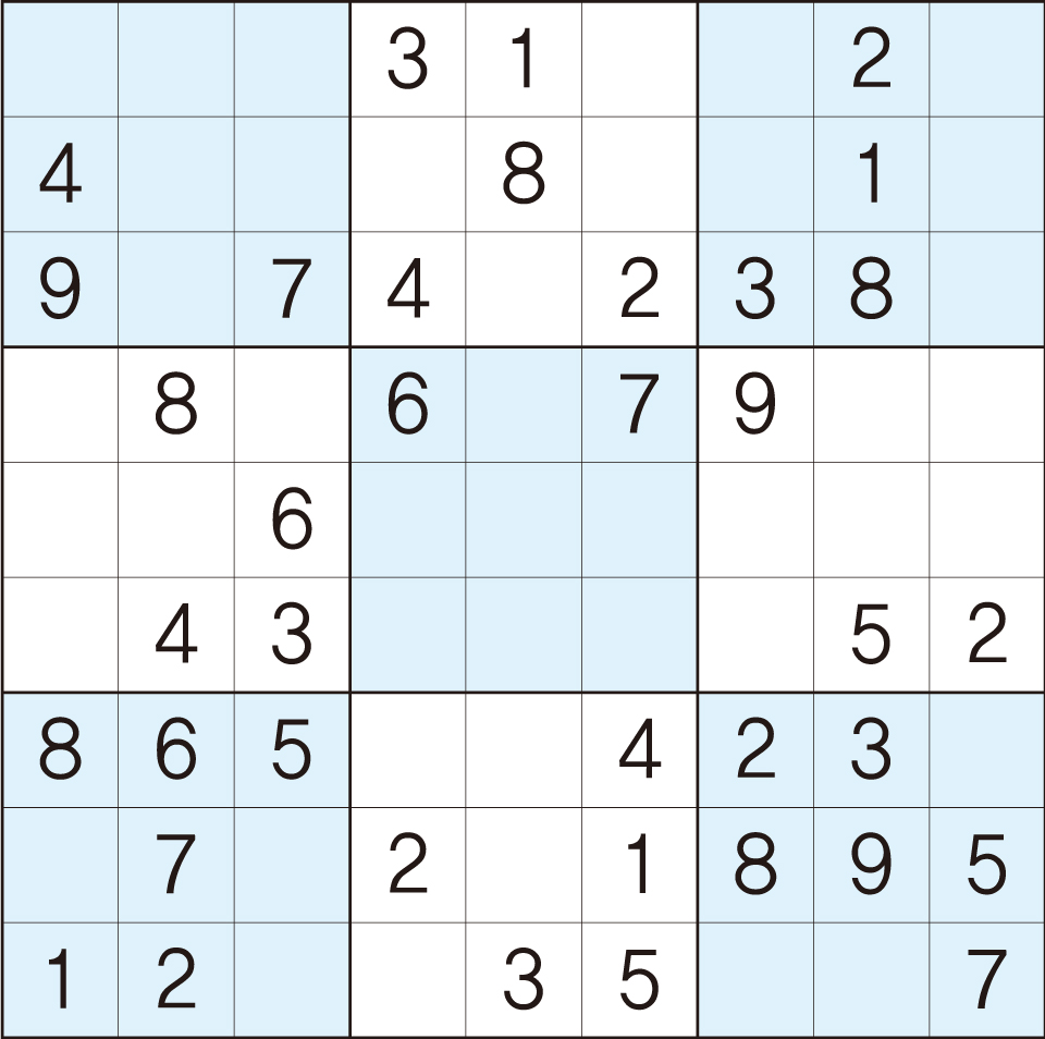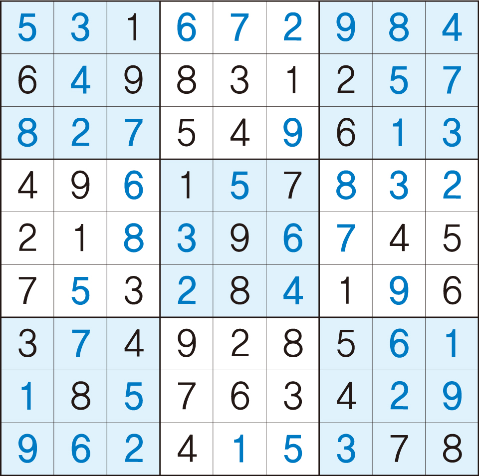 3. 큰 정사각형(9x9) 안에 있는 작은 정사각형(3x3) 안에는 숫자 1~9가 각 한 번씩 들어간다.