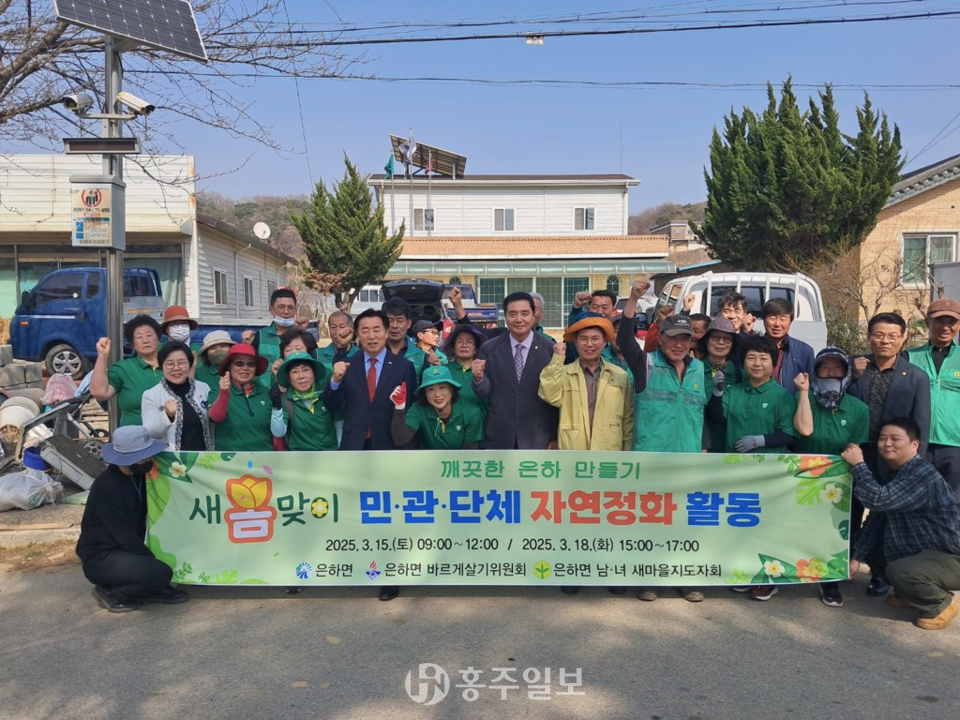은하면은 지난 15일과 26일 바르게살기운동 은하면위원회(위원장 최영선), 새마을지도자회(회장 오덕근), 새마을부녀회(회장 송미경), 주민과 공무원 등 50여 명이 참여한 가운데 장척리 포항마을 광천천 주변과 광천 IC를 중심으로 은하면 진입 주요 도로변‧마을 안길에 방치된 각종 생활 쓰레기를 수거하는 새봄맞이 자연정화 활동을 실시했다.<사진>