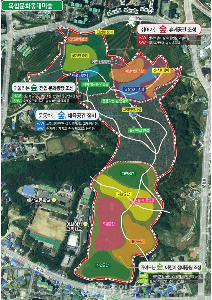 복합문화봉대미숲은 예산읍 예산리에 위치한 19만 6386㎡ 규모의 대형 공원으로 2025년까지 △테마숲 △체육광장 △계류시설 △순환산책로(황톳길) 등이 조성될 예정이다. 특히 황톳길로 조성되는 산책로는 주민들의 건강한 여가 활동을 돕는 동시에 자연 친화적인 공간으로 기대를 모으고 있다.