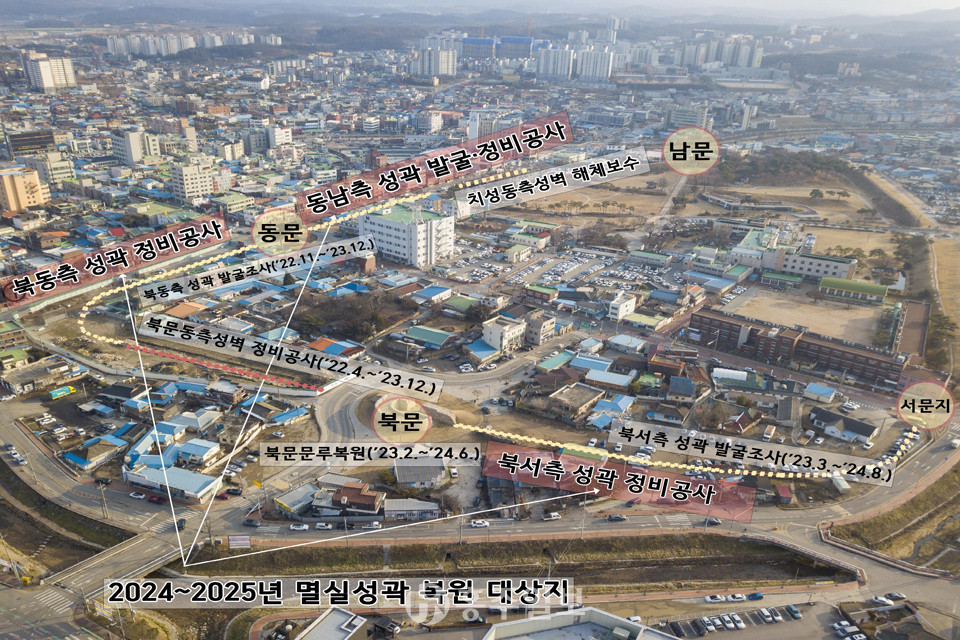 군은 지난 2023년 3월부터 2024년 8월까지 북서측 성곽 발굴조사(A=6690㎡)를 했으며 2023년 7월부터 2024년 12월까지 실시설계와 설계승인을 했었다.