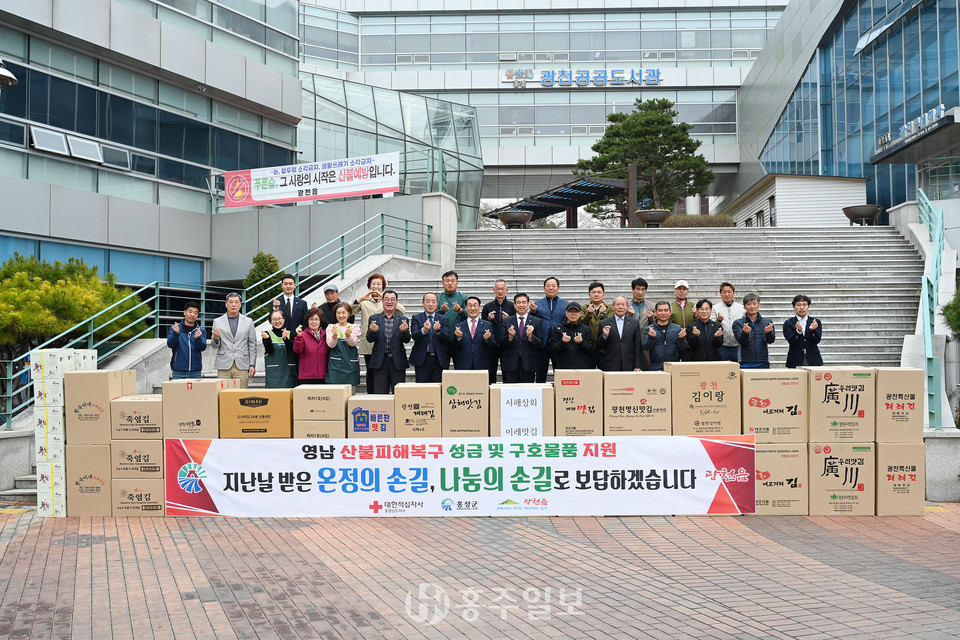 광천읍(읍장 정동규)은 지난 9일 광천읍행정복지센터에서 이용록 홍성군수, 대한적십자사 충남지사, 광천읍 기관단체장, 사업자, 읍민 등이 참석한 가운데 영남 산불피해복구를 위한 성금 및 현물 전달식을 가졌다.<사진>
