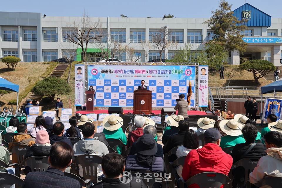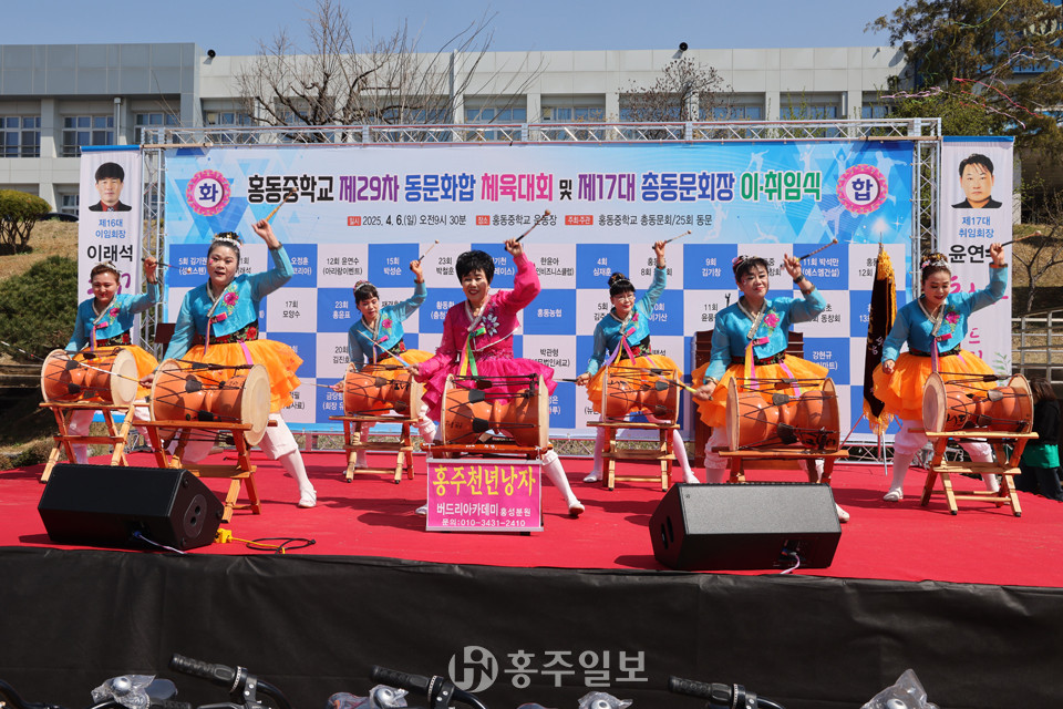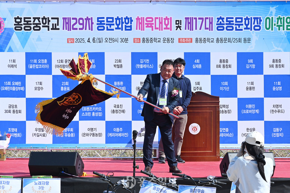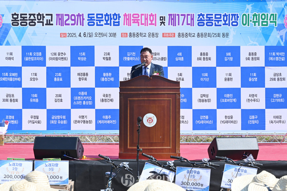 [홍주일보 홍성=한기원 기자] 홍동중학교총동문회(이임회장 이래석·취임회장 윤연수)는 지난 6일 모교 대운동장에서 ‘제16·17대 총동문회장 이·취임식과 제29차 동문화합 체육대회’를 개최했다.<사진>