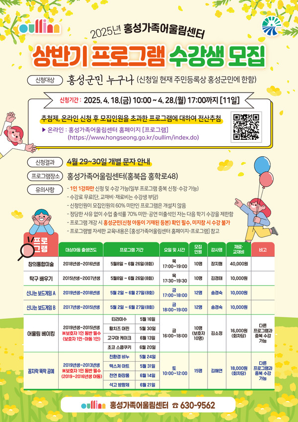 한편 운영 강좌의 세부 내용은 홍성가족어울림센터 누리집에서 확인할 수 있으며, 기타 문의 사항은 홍성가족어울림센터(041-630-9562)로 문의하면 된다.