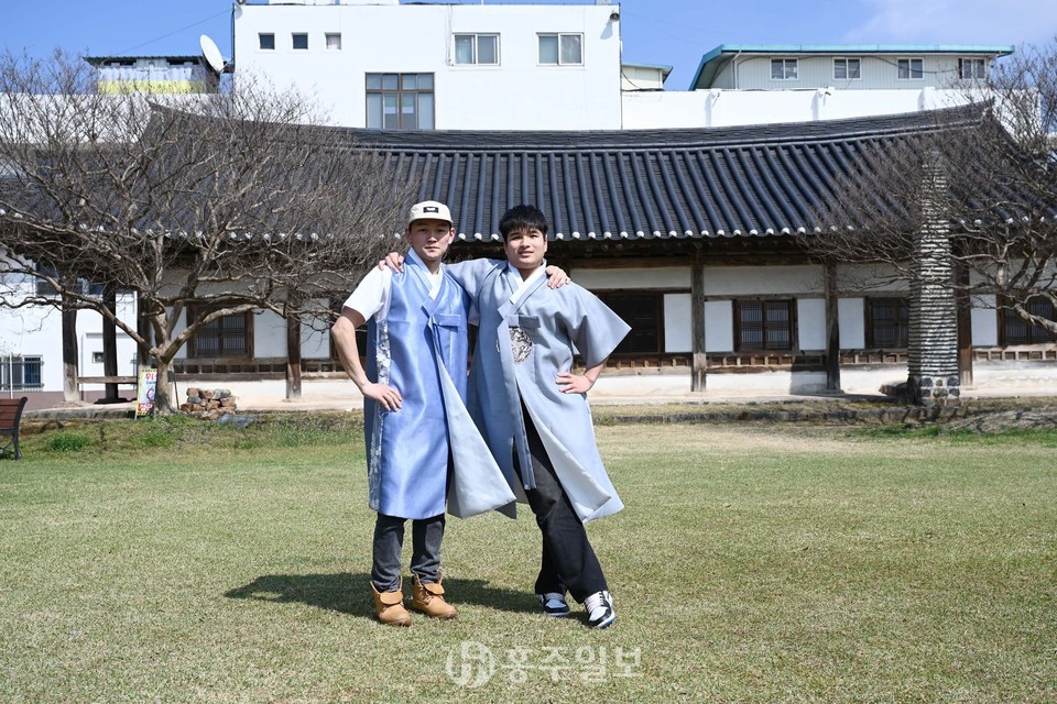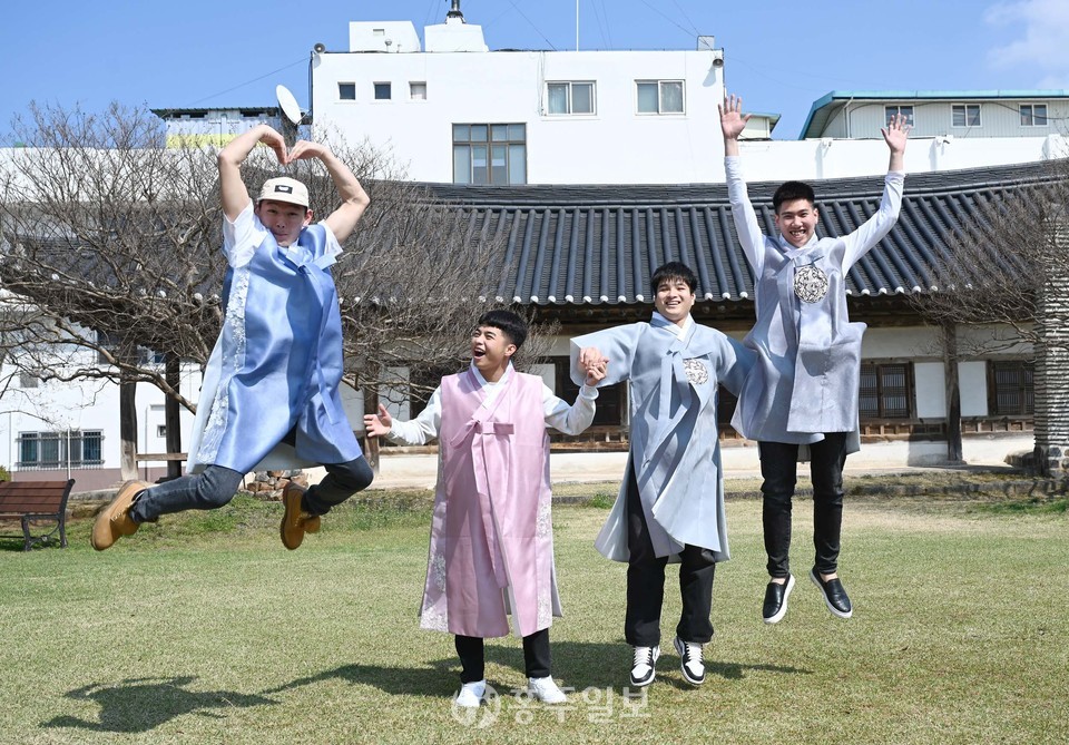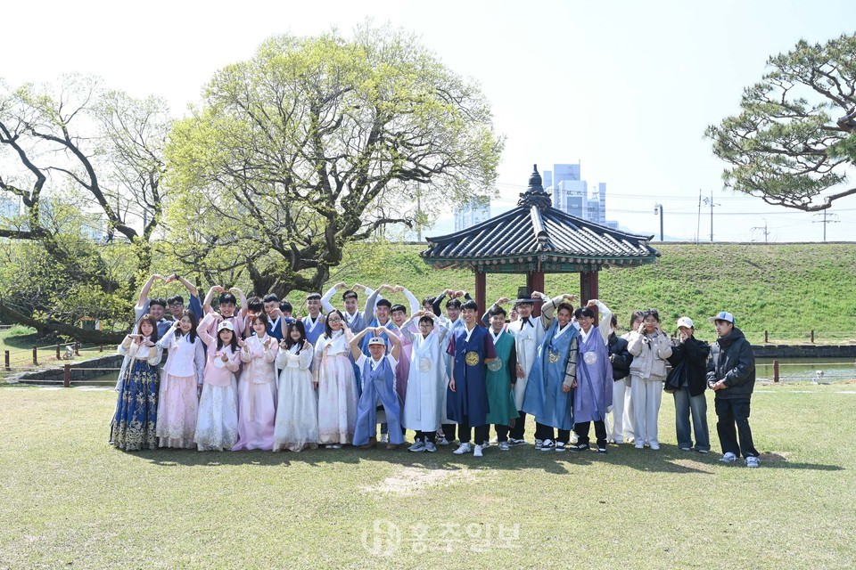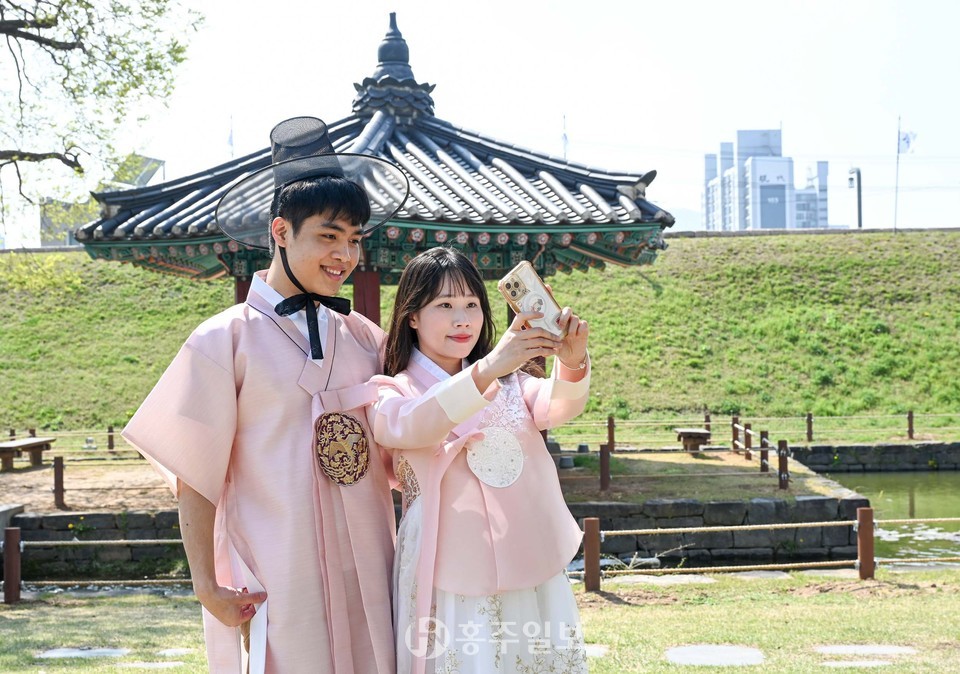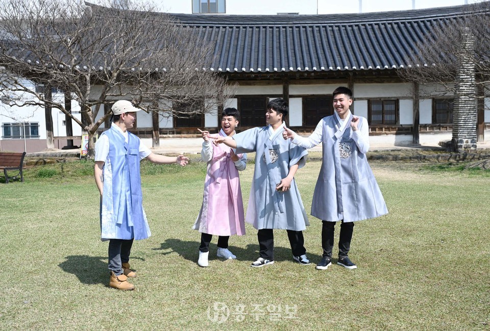지난 15일 혜전대 국제교육원에서 한국어를 배우고 있는 외국인 학생들이 홍성군 안회당과 여하정에서 한복을 입고 사진을 찍고 있다.