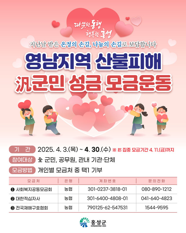 모금 참여는 사회복지공동모금회(080-890-1212), 대한적십자사(02-3705-3745), 전국재해구호협회(1544-9595) 등을 통해 진행됐으며, 기탁된 성금은 영남지역 산불 피해 복구 및 이재민 지원 활동에 사용될 예정이다.