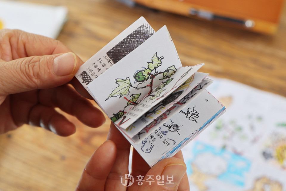 이렇게 완성에 가까워질 때쯤, 조 작가는 더미북(dummy book)을 만들어 그림의 전체적 흐름과 디자인을 확인한다. 여기에서 더미북이란 출간 전 샘플로 볼 수 있는 가제본 그림책을 말한다. 그리고 조 작가는 이때 ‘진짜 글’이 써진다고 말한다.