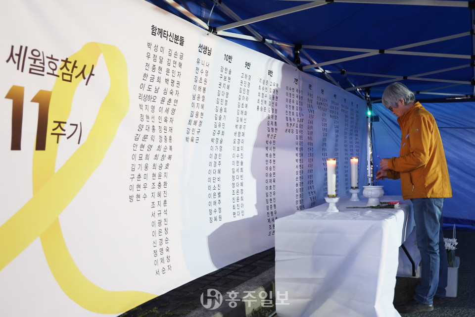 [홍주일보 홍성=이정은 기자] 세월호 추모곡이 나지막이 울려퍼지던 지난 10일 오후 7시, 홍성읍 복개주차장에선 홍성문화연대가 마련한 ‘세월호 참사 11주기 기억 문화제’가 열렸다.