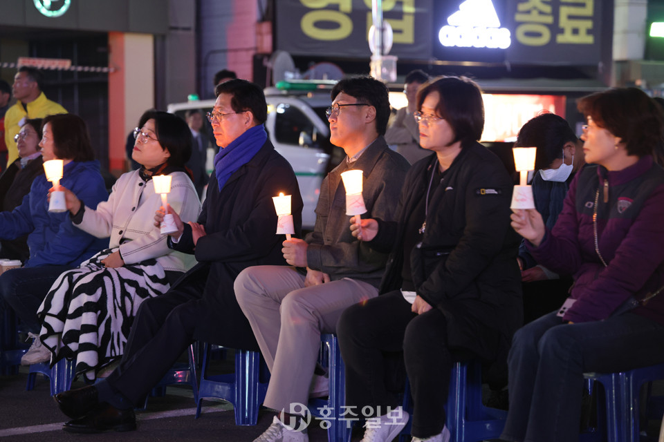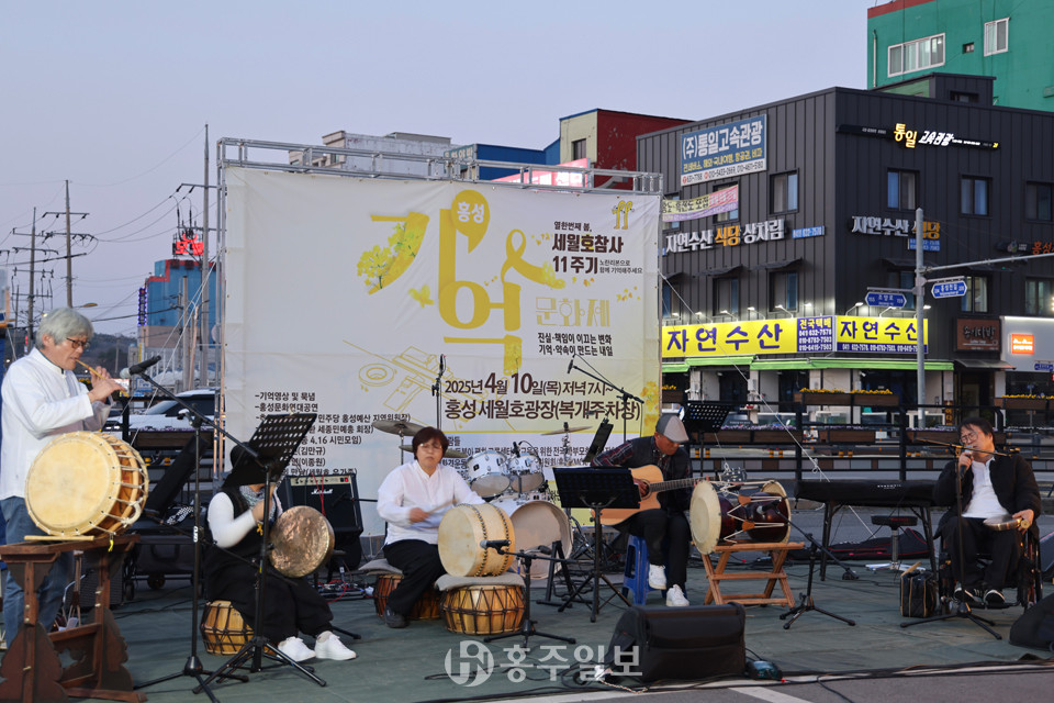 묵념을 시작으로 홍성문화연대의 사물놀이 공연이 이어졌으며, 양승조 민주당 홍성예산지역위원장이 추모 발언을 위해 무대에 자리했다.
