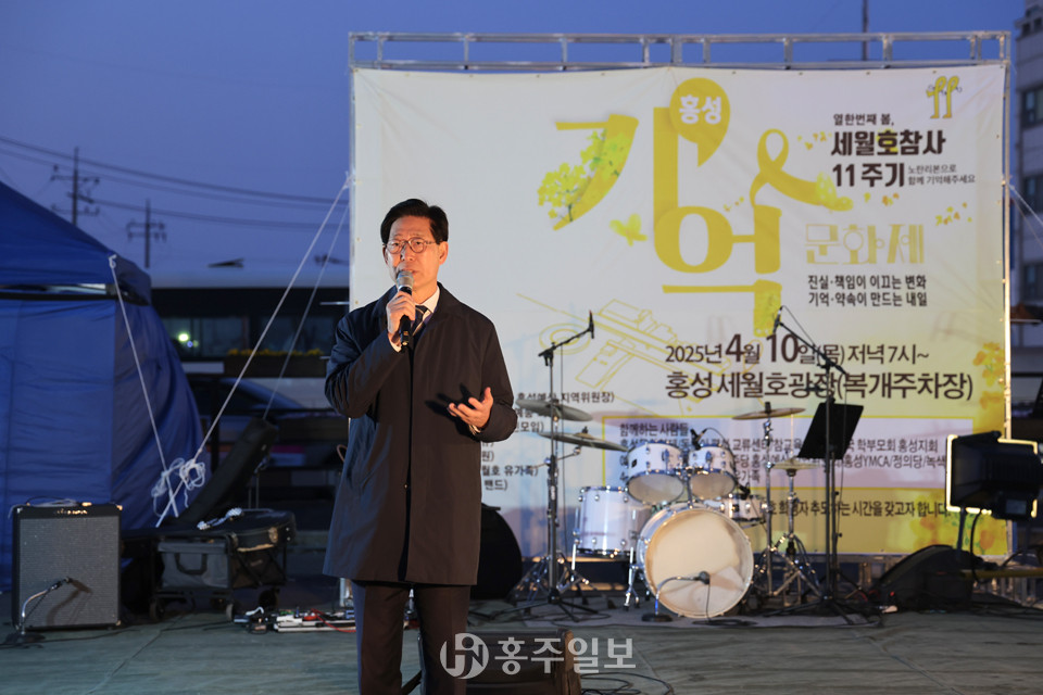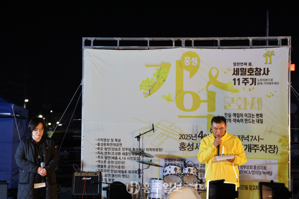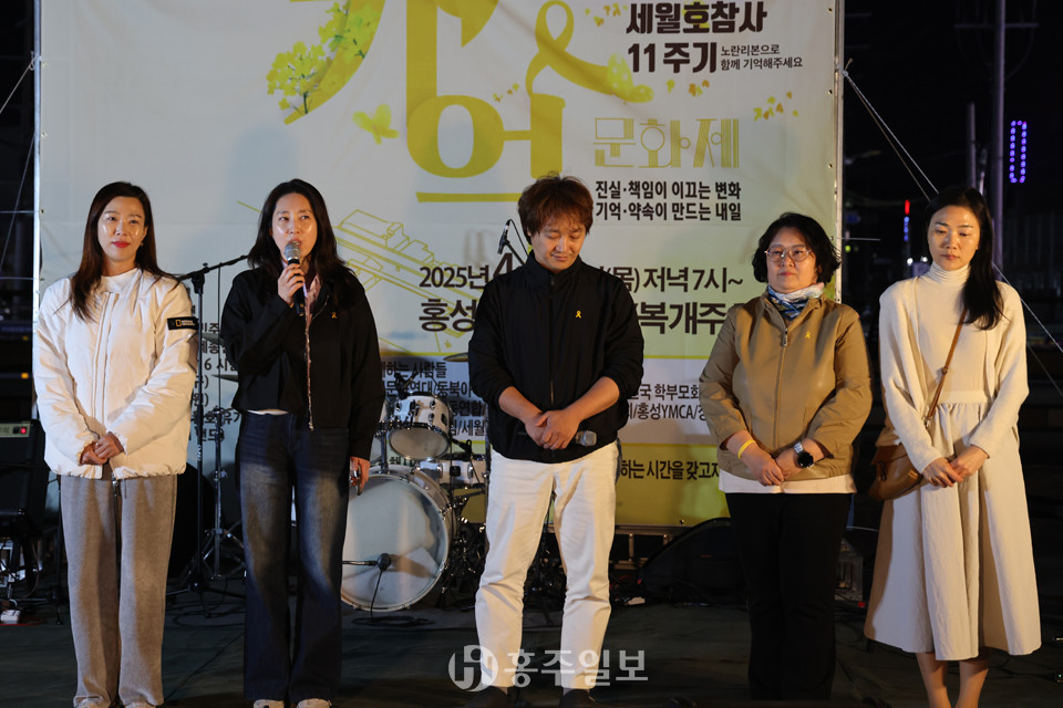 조성환 세종민예총 회장의 구슬픈 피리 연주에 뒤이어 세종 4.16 시민모임의 추모 발언이 있었다. 진나리 씨는 “잊지 않겠다는 다짐으로 11년을 걸어왔다”며 말문을 열었다. “매년 4월이면 세월호에 대한 기억이 다시금 단단하게 새겨진다”면서 “세종에만 머물지 않고 홍성과 함께 따뜻한 마음을 함께 하게 돼 위로가 된다”고 말했다. 끝으로 “함께 아픔을 기억하고 진실을 밝히면서 앞으로 이런 일이 반복되지 않도록 함께 가는 이 길이 희망의 길이라고 생각된다”고 전했다.