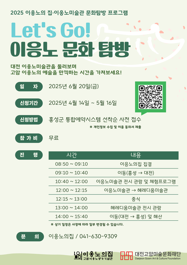 김태기 군 문화관광과장은 “이 프로그램은 이응노의 삶과 예술세계를 따라가며 지역 문화유산에 대한 이해를 높일 수 있도록 기획됐다”면서 “보다 많은 주민과 관람객들이 이응노의 예술을 가까이에서 느끼는 계기가 되길 바란다”고 전했다.