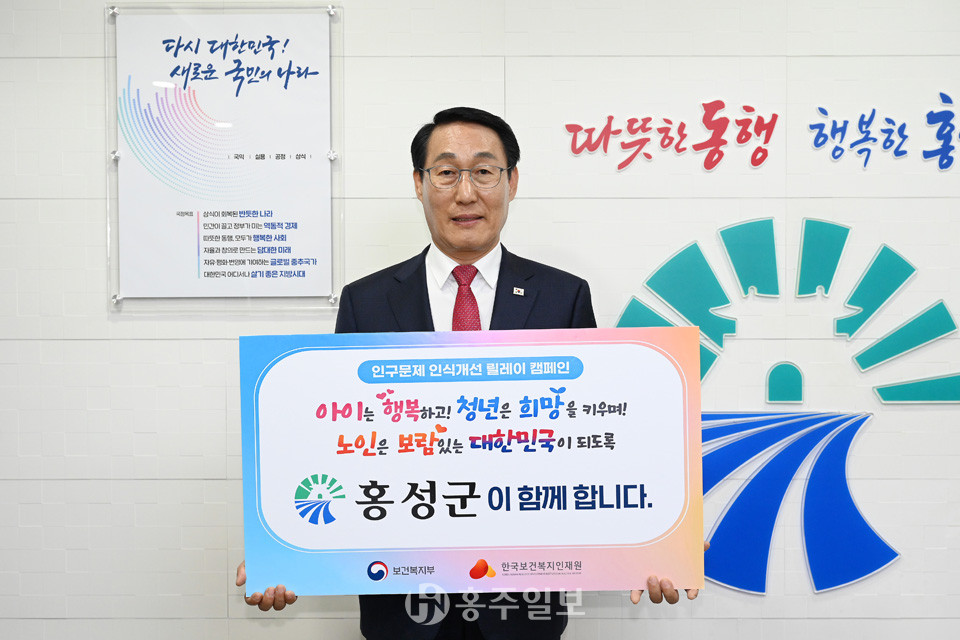 이용록 홍성군수가 인구문제 인식개선에 대한 공감대 형성에 동참하기 위해 보건복지부와 한국보건복지인재원이 공동으로 기획한 ‘인구문제 인식개선 릴레이 캠페인’에 동참했다.<사진>