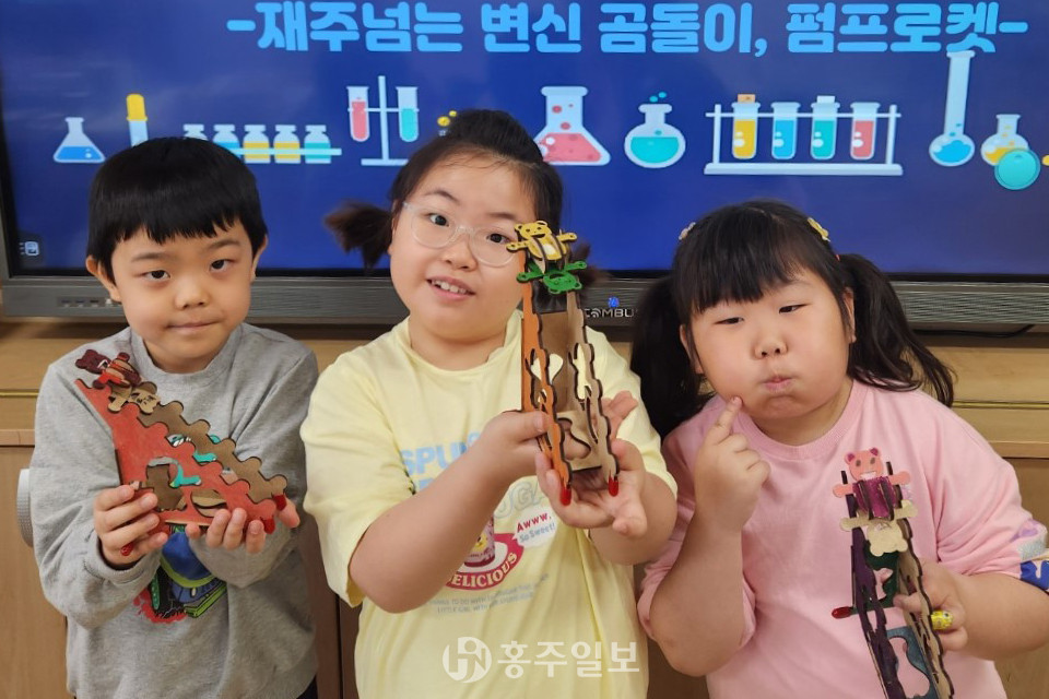 1~3학년 학생들은 재주넘는 변신 곰돌이, 각도조절 펌프 로켓, 이륜레이싱 범퍼카 등 여러 가지 과학 키트를 만들며 창의력을 발휘했다. 이 과정에서 학생들은 과학 원리와 함께 조립의 재미를 느끼며 학습할 수 있었다.<사진>