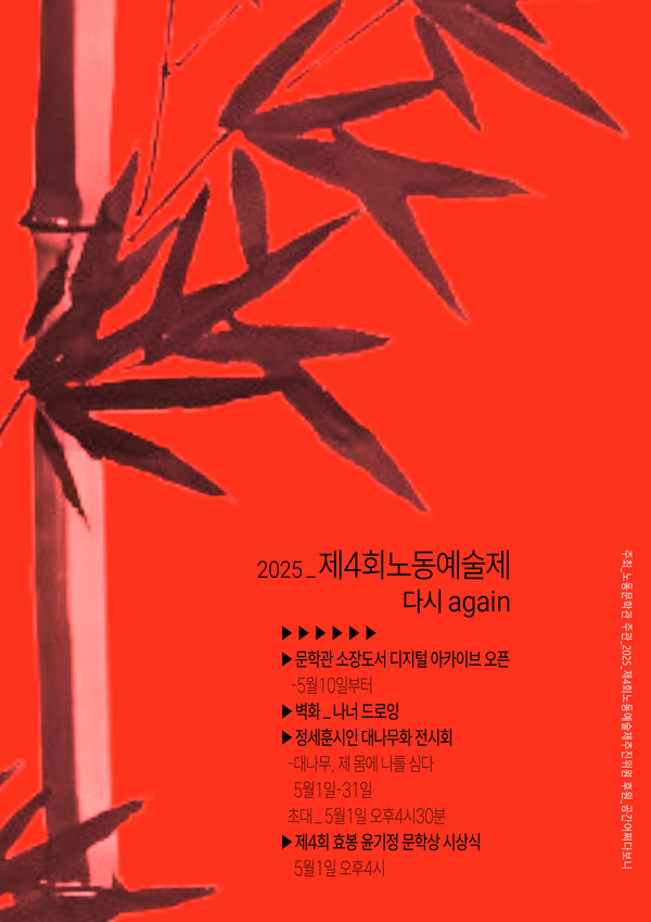 노동예술제는 노동절인 5월 1일 개막해 오후 4시 ‘제4회 효봉윤기정문학상 시상식’에 이어 4시 30분 ‘정세훈 시인의 대나무화 전시회 초대식’을 갖는다.