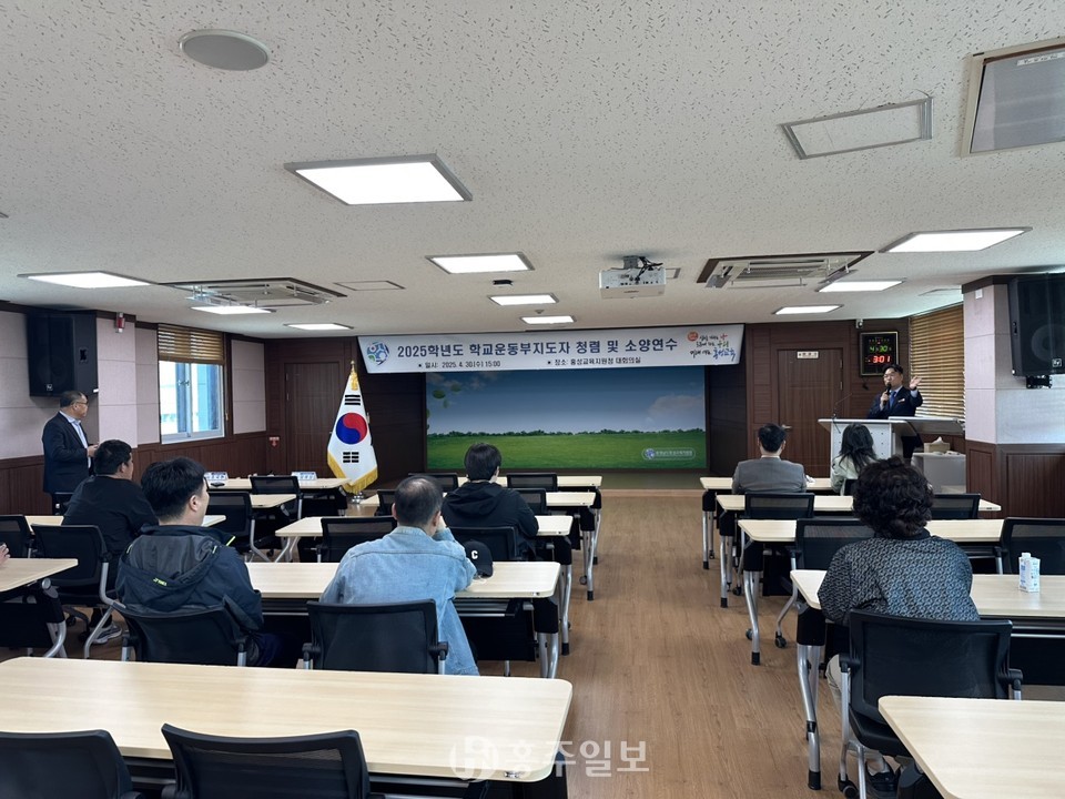 충청남도홍성교육지원청(교육장 임광섭)은 지난달 30일 홍성교육지원청 대회의실에서 지역 내 초·중·고 학교운동부지도자를 대상으로 ‘2025학년도 학교운동부지도자 청렴 및 소양 연수’를 실시했다.<사진>