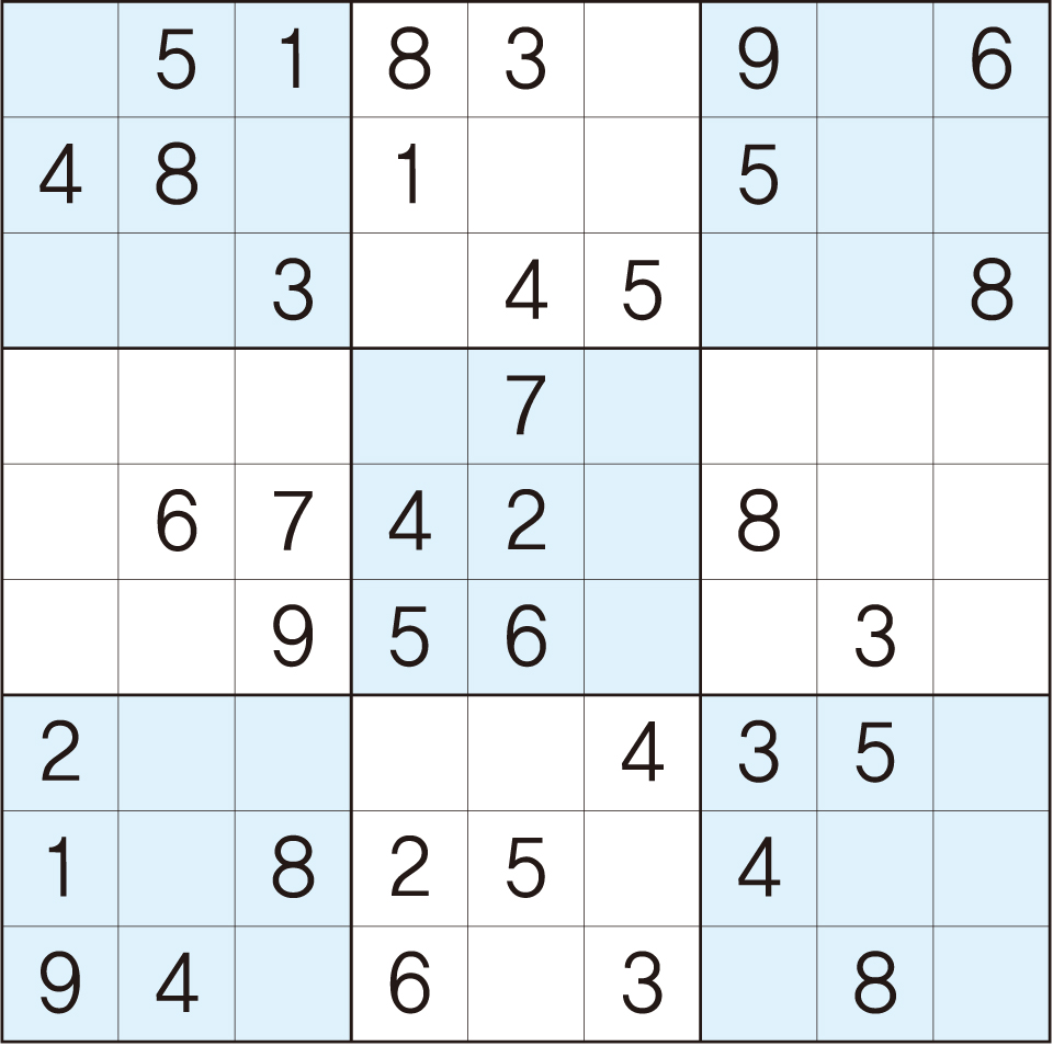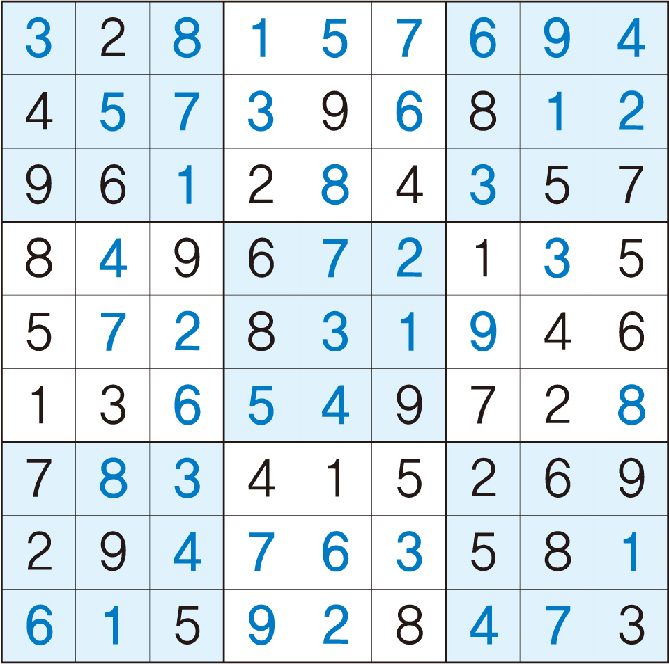 3. 큰 정사각형(9x9) 안에 있는 작은 정사각형(3x3) 안에는 숫자 1~9가 각 한 번씩 들어간다.
