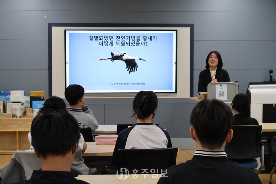 이번 특강은 황새공원의 김수경 박사가 강연을 맡아, 황새의 생태적 특징과 더불어 인간과 자연의 공존을 위한 다양한 노력들을 소개했다. 학생들은 황새 보호 활동의 의미와 생태계 유지의 중요성에 대해 배우며, 인간이 자연과 조화를 이루며 살아가기 위한 실천 방안에 대해 토의하고 발표하는 시간을 가졌다.