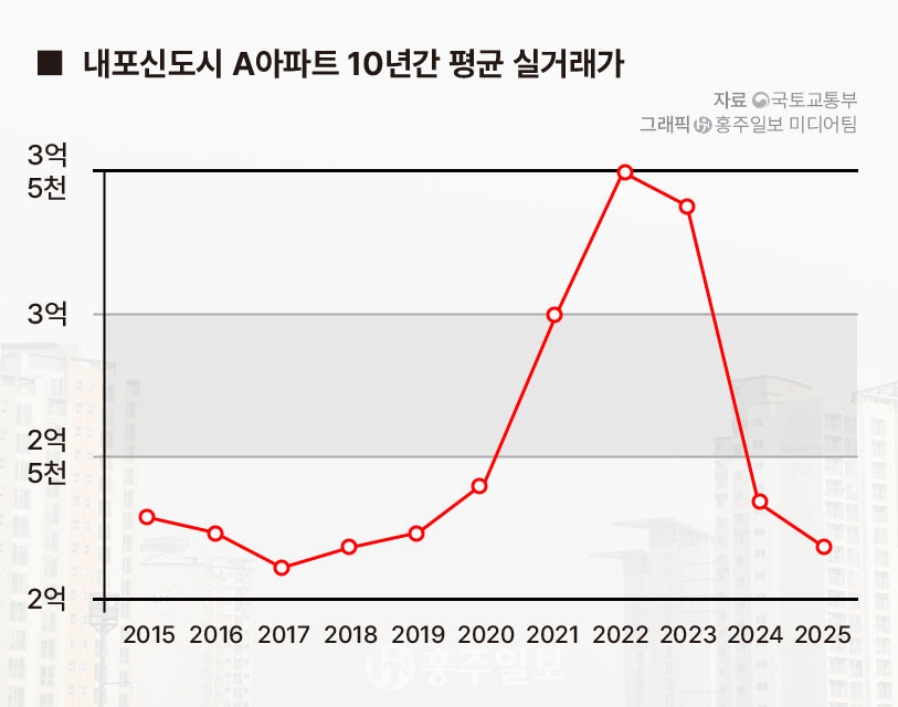 국토교통부 실거래가에 따르면, 2025년 5월 현재 내포신도시에 위치한 A아파트(전용 84㎡ 기준) 매매가는 2015년 2억 2800만 원에서 2023년 일시적으로 3억 원 중반까지 급등했다가, 최근 들어 다시 2억 3500만 원 이하로 하락했다. 10년 전 수준으로 회귀한 것이다. 신축 아파트 월세 역시 50만 원까지 떨어지며 10년 전 원룸 시세와 비슷한 수준을 기록하고 있다.