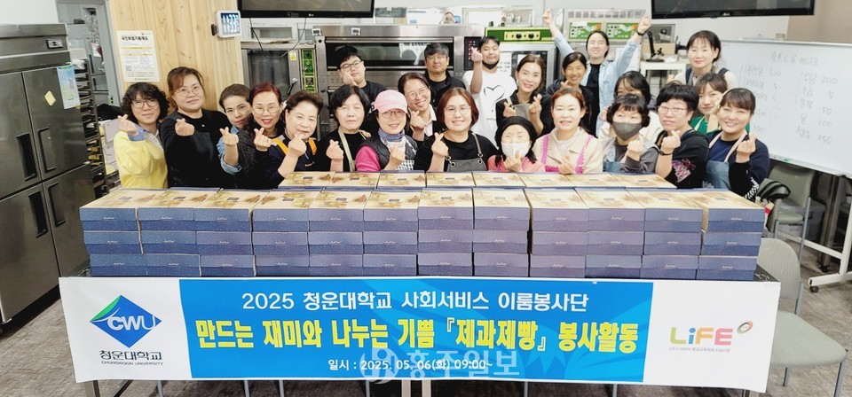 청운대학교(총장 정윤) 사회서비스대학은 지난 6일 홍주제과기술학원(원장 채선병)에서 가정의 달을 맞이해 지역 이웃을 위한 ‘행복 나눔 케이크 만들기’ 봉사활동을 진행했다.<사진>