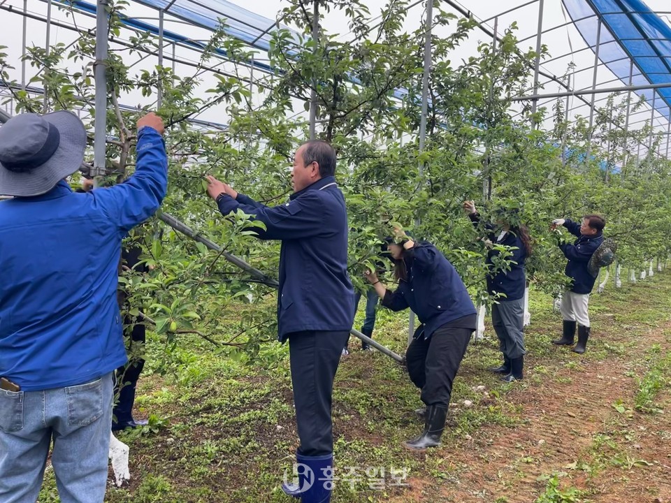 지난 15일 광천읍행정복지센터, 홍보전산담당관, 농업정책과 직원 30여 명은 상정리 소재의 농가에 방문해 사과 적과, 가지정리 작업 등 일손을 보태고 농업 현장의 목소리를 청취하는 뜻깊은 시간을 보냈다.