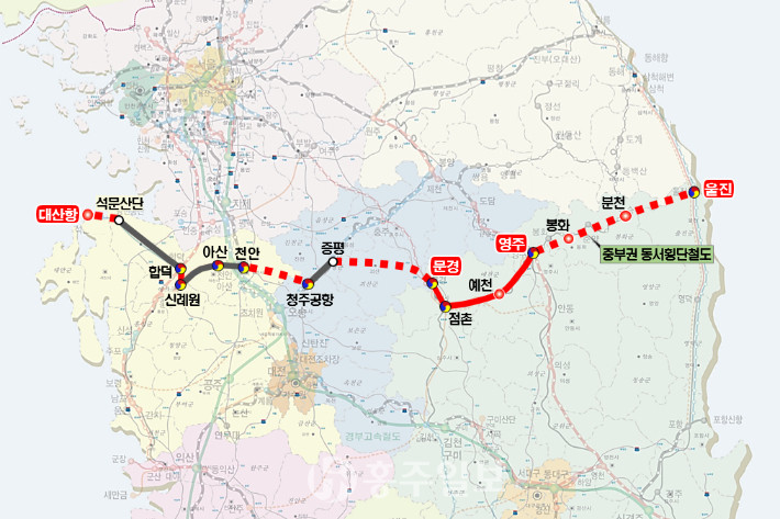 중부권 동서횡단철도는 충남(서산시, 당진시, 예산군, 아산시, 천안시), 충북(청주시, 증평군, 괴산군), 경북(문경시, 예천군, 영주시, 봉화군, 울진군) 등 3개 도 13개 시·군을 연결하는 약 330km의 대규모 국책사업으로, 내륙 동서축 교통망 구축을 통해 국토 균형발전과 지역경제 활성화를 목표로 한다.<사진>