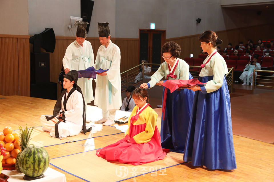 [홍주일보 홍성=한기원 기자] 스무 살을 맞은 청년들이 전통성년식을 통해 어른으로서의 첫걸음을 내디뎠다. 이날 청년들은 한복을 차려입고 관·계례를 올리며 성년의 의미를 되새겼다. 현대식 축하가 익숙한 요즘, 전통 방식으로 어른이 되는 경험은 참가자들에게 특별한 의미로 남았다. 사진은 지난 19일 혜전대학교 간호학술관에서 전통성년식 모습.