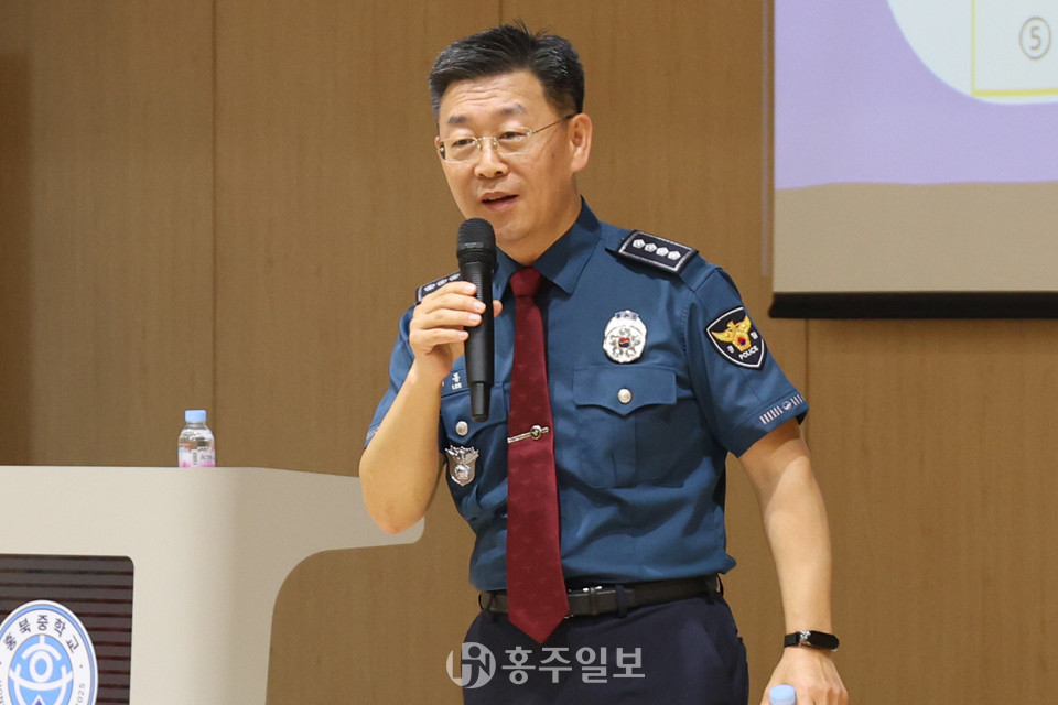 [홍주일보 홍성=한기원 기자] 홍성경찰서 이동규 서장이 30일 오후 홍북중학교 강당에서 전교생 370여 명을 대상으로 경찰서장과 함께하는 맞춤형 ‘청소년범죄 예방’ 특별 교육을 실시했다.<사진>