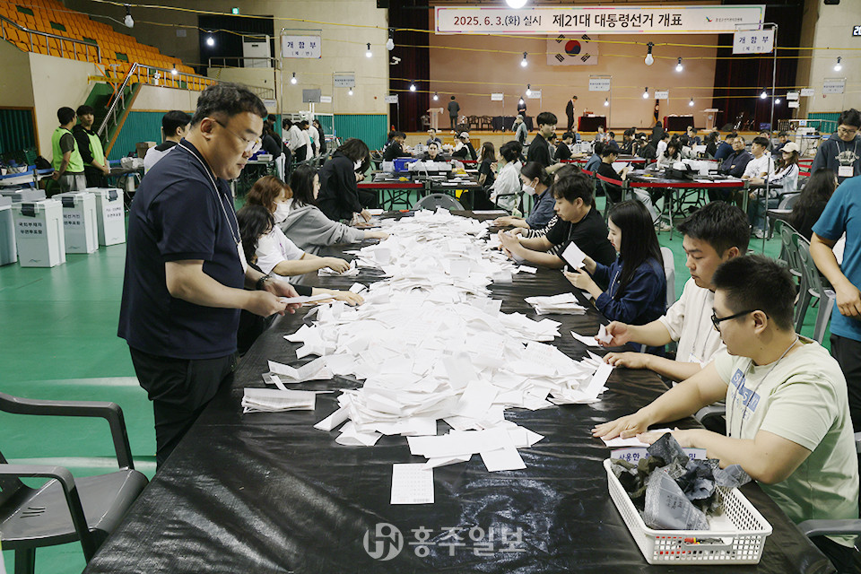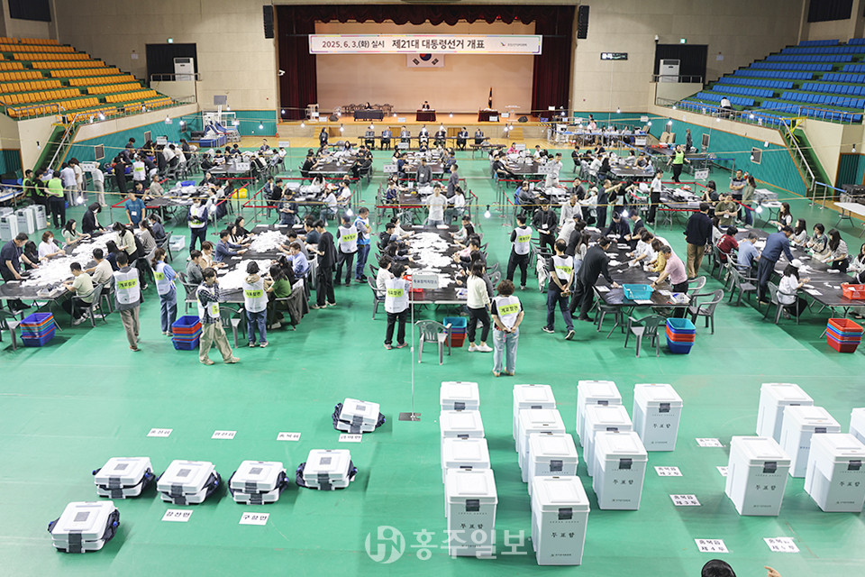 [홍주일보 홍성=김영정 기자] 제21대 대통령선거 개표가 시작됐다. 3일 오전 6시부터 오후 8시까지 진행된 본 투표를 마친 이후, 지역 내 투표소에서 투표함이 홍주문화체육센터에 마련된 개표소에 속속 도착하면서 개표 작업이 진행되고 있다.