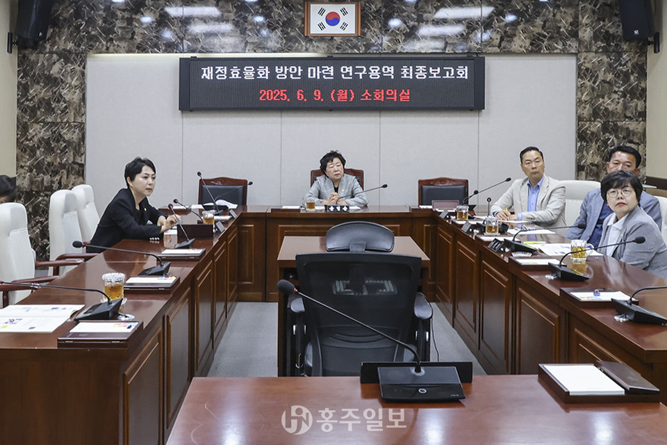 홍성군의회 의원 연구단체 ‘재정 효율화 방안 정책연구회(대표 윤일순 의원)’가 지난 9일 의회 1층 소회의실에서 ‘홍성군 재정진단을 통한 재정효율화 방안 마련 연구용역’ 최종보고회를 개최했다.<사진>