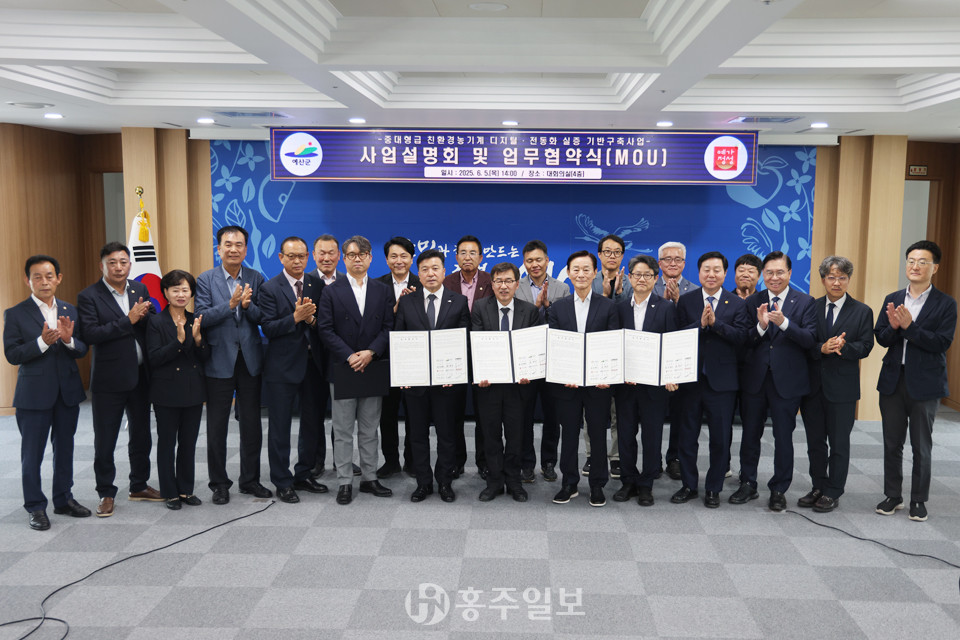 [홍주일보 홍성=김영정 기자] 예산군은 지난 5일, 군청 대회의실에서 ‘중대형급 친환경농기계 디지털 전동화 실증 기반구축사업’ 사업설명회 및 업무협약식을 성황리에 개최했다. 이날 행사에는 충청남도와 예산군, 충남대학교, 한국기계연구원, 한국생산기술연구원, 한국로봇융합연구원, 농기계 에너빌리티 기술사업화연구소 등 주요 연구기관과 LS엠트론, TYM, DIC 등 농기계 관련 기업, 예산군의회와 충남도의회 등 산·학·연·관 관계자 약 50여 명이 참석해 사업의 성공적 추진을 위한 협력 의지를 다졌다.