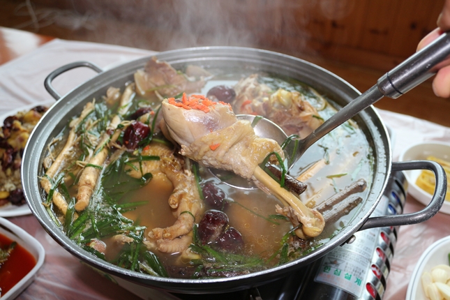 옻닭<사진>은 옻을 삶을 때 나온 검은 빛을 띠는 육수에 황기, 대추 등 갖은 한방재료를 넣어 향이 그윽하고 연하면서 쫄깃쫄깃한 맛을 낸다. 또 육질에 배인 옻의 좋은 성분과 한약재가 어우러져 국물 맛이 시원하면서도 감칠맛이 돈다.