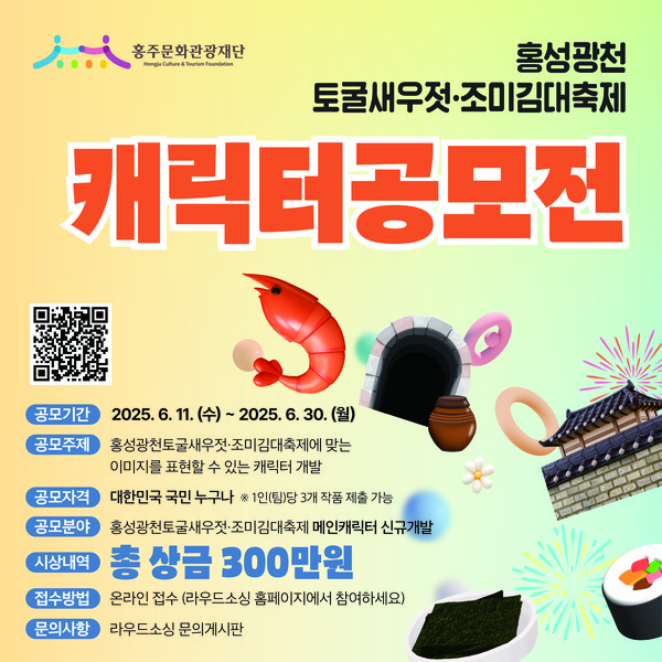 홍주문화관광재단(대표이사 최건환)이 홍성군의 대표 축제 중 하나인 광천토굴새우젓·조미김대축제 홍보에 활용하기 위한 캐릭터 공모전을 개최한다.
