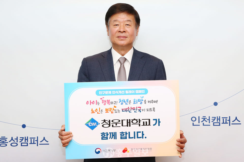 [홍주일보 홍성=한기원 기자] 청운대학교 정윤 총장이 보건복지부와 한국보건복지인재원에서 주관하는 ‘인구문제 인식개선 릴레이 캠페인’에 동참했다.<사진>