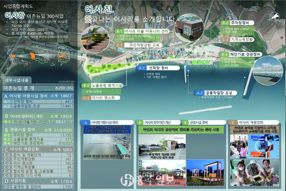 어사항의 경우 지난 2021년 12월 대상지 선정 후, 2022년 2월 한국어촌어항공단과 위수탁 협약을 체결하고, 상가 현대화, 공동작업장 조성, 해안경관 정비, 주차장 등 다양한 인프라 구축을 목표로 추진됐다.