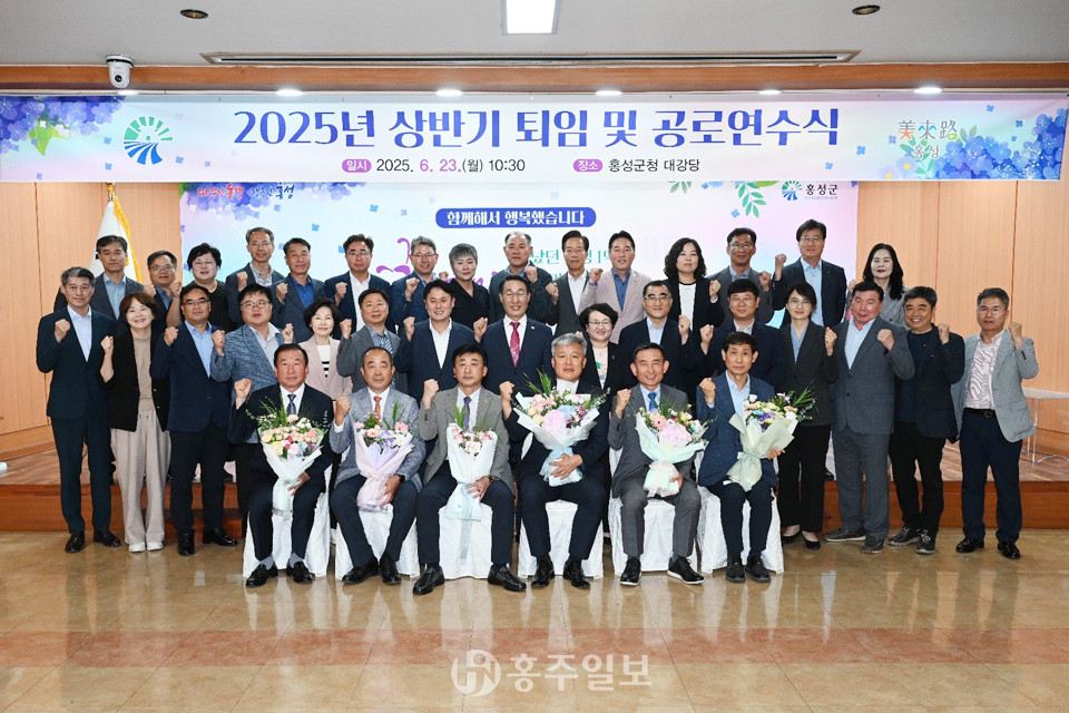[홍주일보 홍성=한기원 기자] 2025년 상반기 퇴임 및 공로연수식이 지난 23일 홍성군청 대강당에서 열렸다. 이용록 홍성군수는 “홍성군 발전에 헌신 봉사해 온 상반기 퇴직·공로연수 공무원과 아쉬운 석별의 시간을 가졌다”고 아쉬움을 표현하며 “인생의 황금기를 오로지 지역발전에 열정을 쏟아 주셨음에 군민의 한사람으로서 그 노고에 위로를 드린다”고 격려했다. 이어 “여러분께서 다져 놓은 토대 위에 후배 공직자는 더욱 열심히 뛰어서 밝은 미래 희망찬 홍성을 만들 것”이라고 다짐하며 “영예로운 퇴임을 진심으로 축하드리며, 멋진 인생 2막을 기대한다”고 말했다.