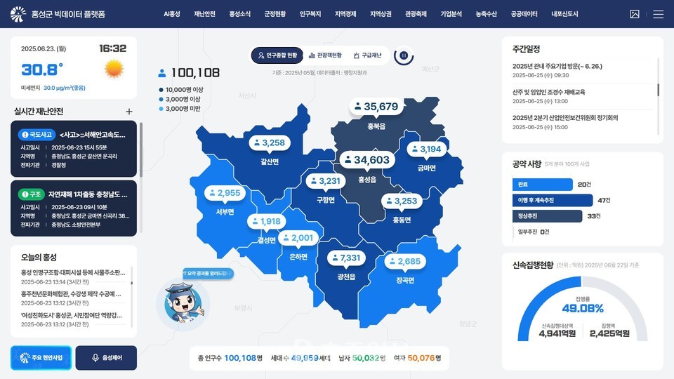 빅데이터 통합 플랫폼은 내부 데이터 180건, 외부 API 36건, 민간 데이터 68개 등 각종 데이터의 유기적인 연계와 통합 관리를 목표로 구축됐으며, 이를 통해 홍성군은 정책 결정을 위한 데이터 기반 행정의 토대를 마련함과 동시에 공공 서비스의 효율성과 투명성을 제고할 것으로 기대된다.