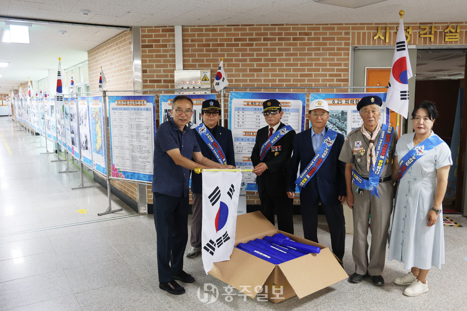 [홍주일보 홍성=김영정 기자] 홍성군보훈단체협의회(회장 최종수)는 지난 24일 내포초등학교에서 ‘6·25, 월남전 사진전시회’를 성황리에 개최했다. 이번 행사는 6·25 전쟁과 베트남전쟁(월남전) 참전용사들의 희생과 애국심을 기리고, 학생들과 지역민들에게 평화와 안보의 소중함을 일깨우기 위해 마련됐다. 올해 행사에는 우상욱 내포초 교장과 곽태우 6·25참전유공자회 홍성지회장, 조한상 고엽제전우회 홍성지회장, 김주호 광천제일장학회 이사장 등 지역 보훈단체와 유관기관 인사들이 참석해 의미를 더했고, 행사 중에는 학생들의 애국심과 보훈의식을 높이고자 내포초등학교에 태극기 50개를 전달하는 시간도 마련됐다. <사진>