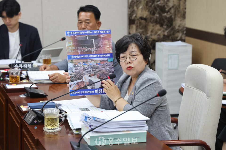 이정희 의원은 더본코리아와 관련한 각종 리스크와 축제 준비 미비, 조리기구 안전·위생 문제를 집중적으로 지적했다. 이 의원은 “최근 언론을 통해 더본코리아의 리스크가 많이 불거지고 있다”며 “타 지역에서 안전검사를 받지 않아 행정처분을 받은 대형 조리기구와 동일한 제품이 홍성에서도 사용되고 있고, 축제 후 조리기구가 방치돼 녹슬고 비위생적으로 관리된 점과 식품 조리기구가 아닌 용기에 음식을 담거나 트럭에 싣고 다니는 등 부적절한 관리 실태가 언론에 보도됐다”고 지적했다.