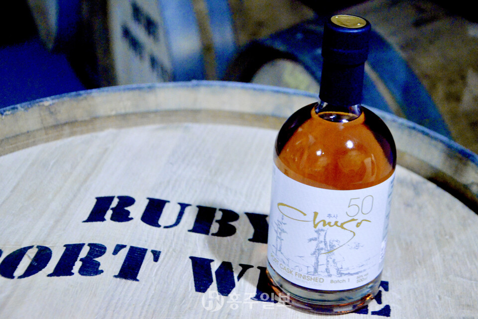 ‘추사50’은 예산에서 수확한 사과 100%를 원료로 한다. 사과를 착즙해 20일 이상 발효한 뒤, 유럽식 동(구리) 증류기로 증류한 후 프랑스산 참나무 숙성통과 포르투갈산 주정강화 와인 숙성통에서 장기간 숙성하는 것이 특징이다. 이 과정에서 사과 본연의 달콤함과 깊은 풍미, 오크통 특유의 바닐라·견과류·구운 헤이즐넛 향이 어우러진다.