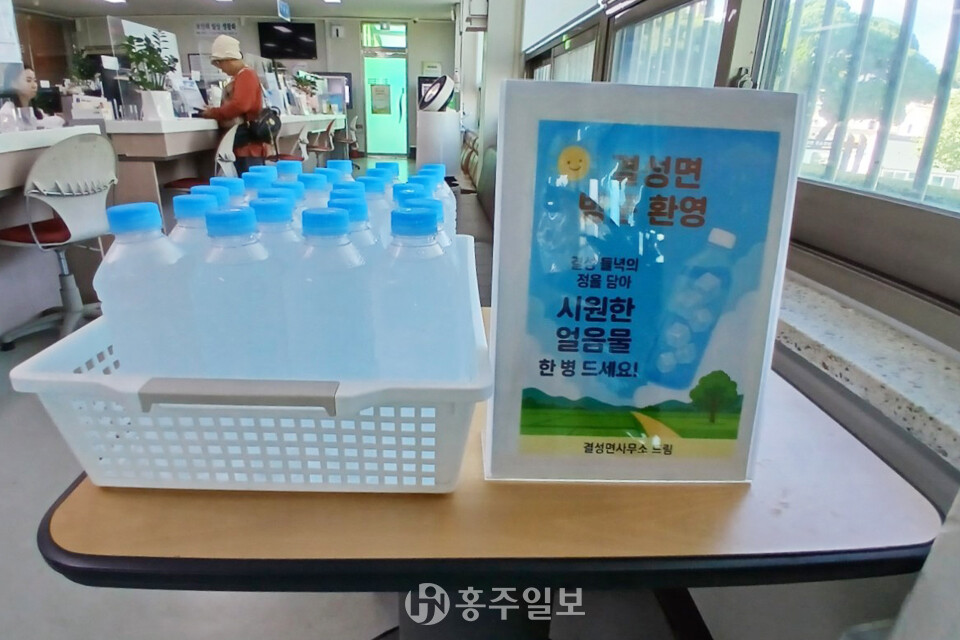 결성면은 기증받은 생수를 얼려 무더운 날씨에 면사무소를 찾는 민원인들이 자유롭게 마실 수 있도록 민원실과 대기 공간 등에 비치해 폭염 예방에 나서고 있다.