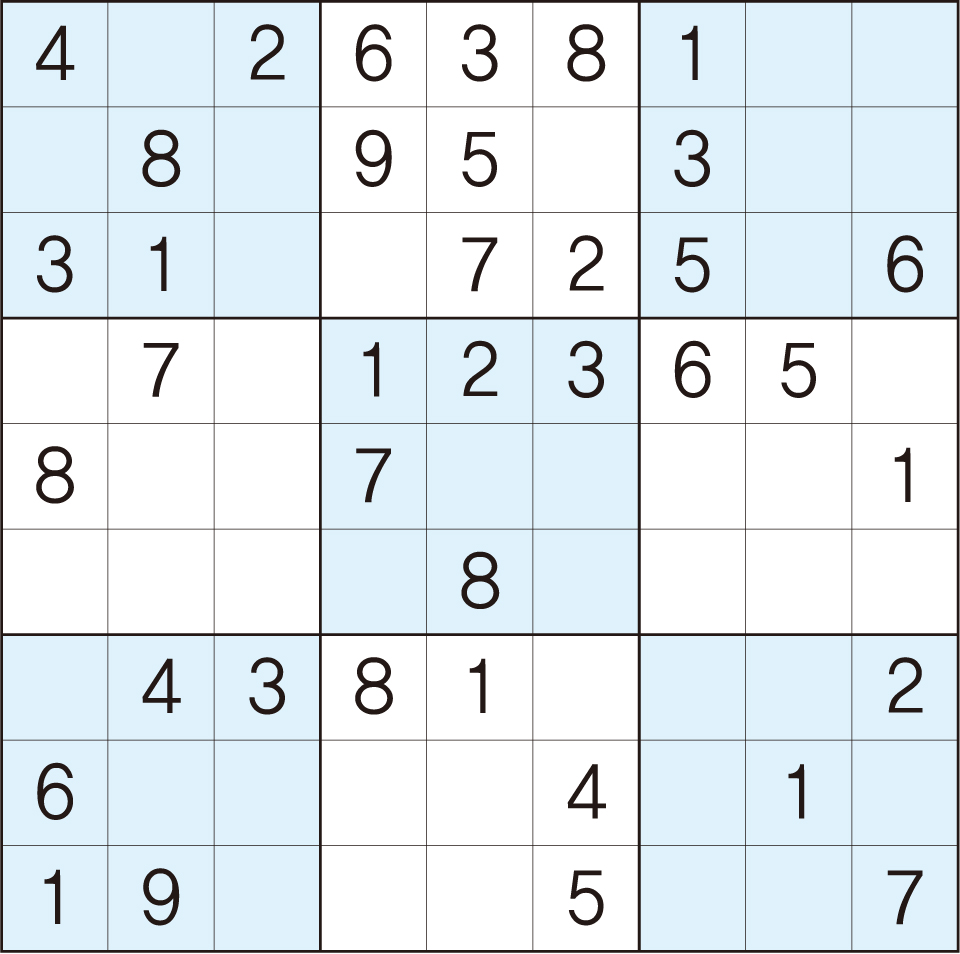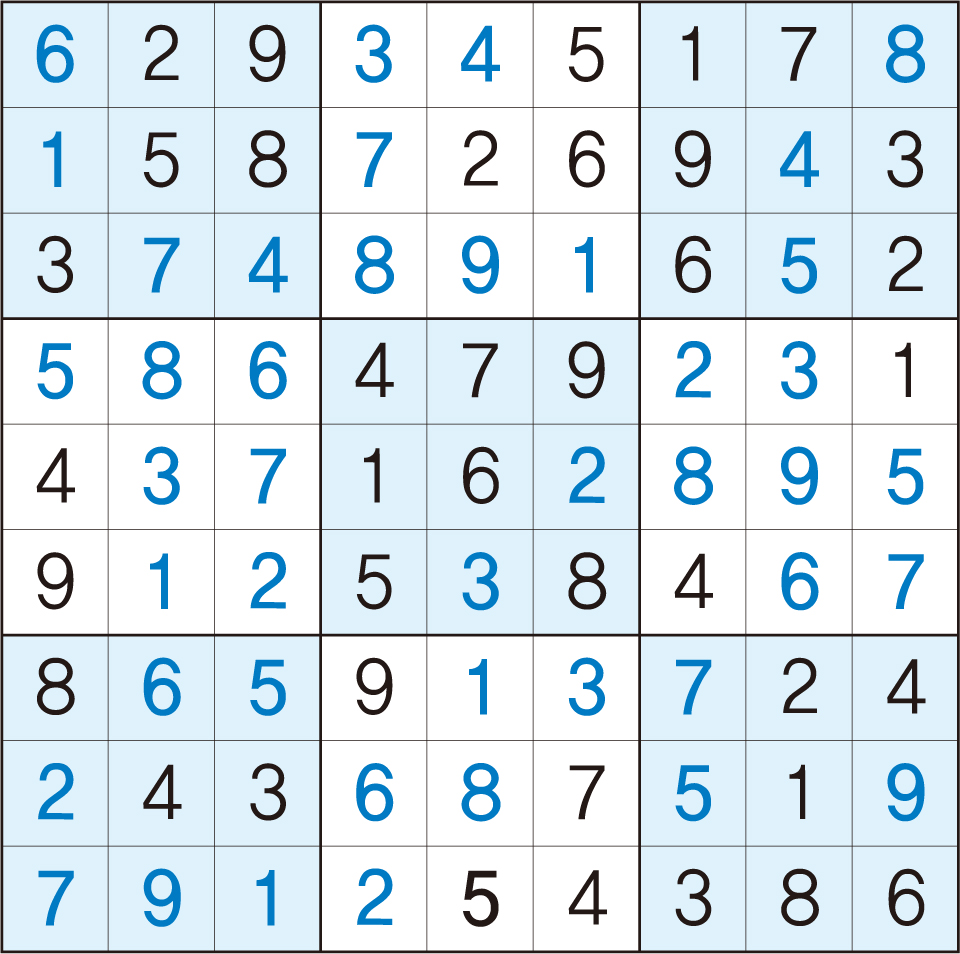 3. 큰 정사각형(9x9) 안에 있는 작은 정사각형(3x3) 안에는 숫자 1~9가 각 한 번씩 들어간다.