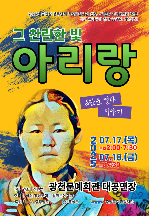 [홍주일보 홍성=한기원 기자] 극단 홍성무대(대표 이상헌)가 창단 32주년을 맞아 광복 80주년 기념 창작극 ‘그 찬란한 빛, 아리랑!’을 오는 17일부터 18일까지 광천문예회관 무대에 올린다.