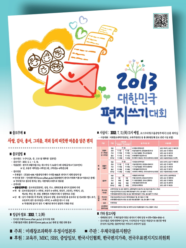 '대한민국 편지쓰기대회'는 국민정서를 함양하고 편지쓰기문화의 저변 확대를 위해 우정사업본부 주관으로 2000년도부터 개최해 오고 있다. 금년에는 사랑, 감사, 용서, 그리움, 격려 등의 따뜻한 마음을 담은 내용의 손편지나 인터넷편지로 누구나 응모할 수 있다.
