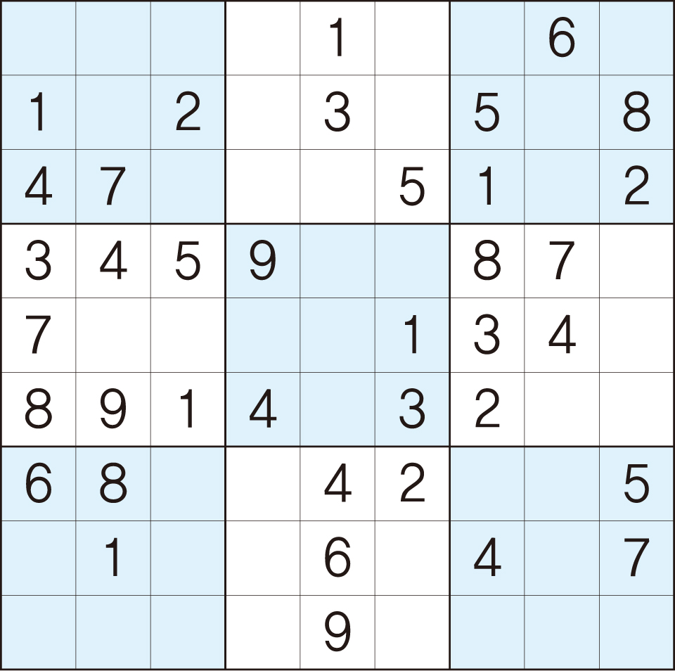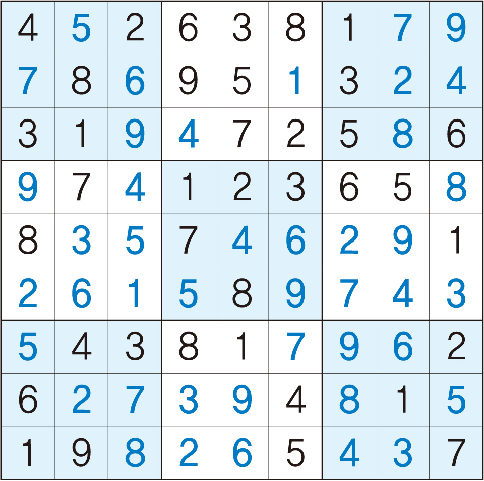 3. 큰 정사각형(9x9) 안에 있는 작은 정사각형(3x3) 안에는 숫자 1~9가 각 한 번씩 들어간다.