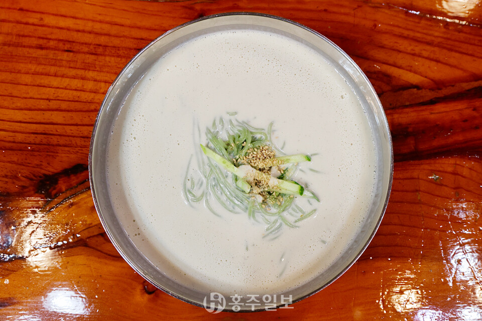 현대아파트 근방에 위치한 월산콩국수는 서리태 콩물과 클로렐라 면을 사용한 푸릇한 콩국수를 판매하고 있다.