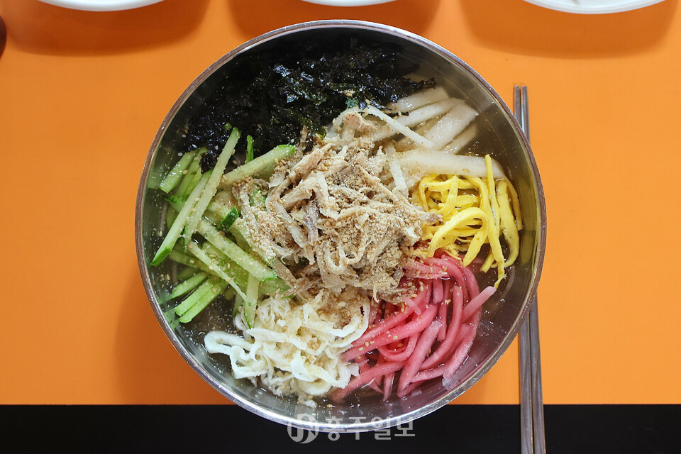 면발이 보이지 않을 정도로 다채롭게 둘러진 7가지 고명이 눈을 사로잡는 동시에 흰자와 노른자를 따로 분리해 지단을 부쳐낸 주인의 정성이 전달된다. 이 일곱 가지 고명은 색감으로 눈을 즐겁게, 식감으로 입을 즐겁게 한다. 잡내 없이 시원하면서도 담백한 육수는 각 재료가 제 몫을 해내게끔 맛을 헤치지 않으면서 지원하는 응원군 같다. 여름을 상징하는 이 음식을 먹는데, 한겨울 추위가 엄습한다. 코를 훌쩍이며 그릇을 비워낸다.