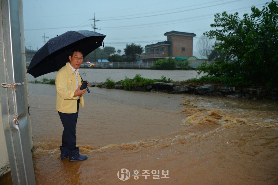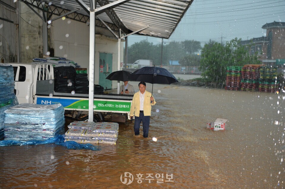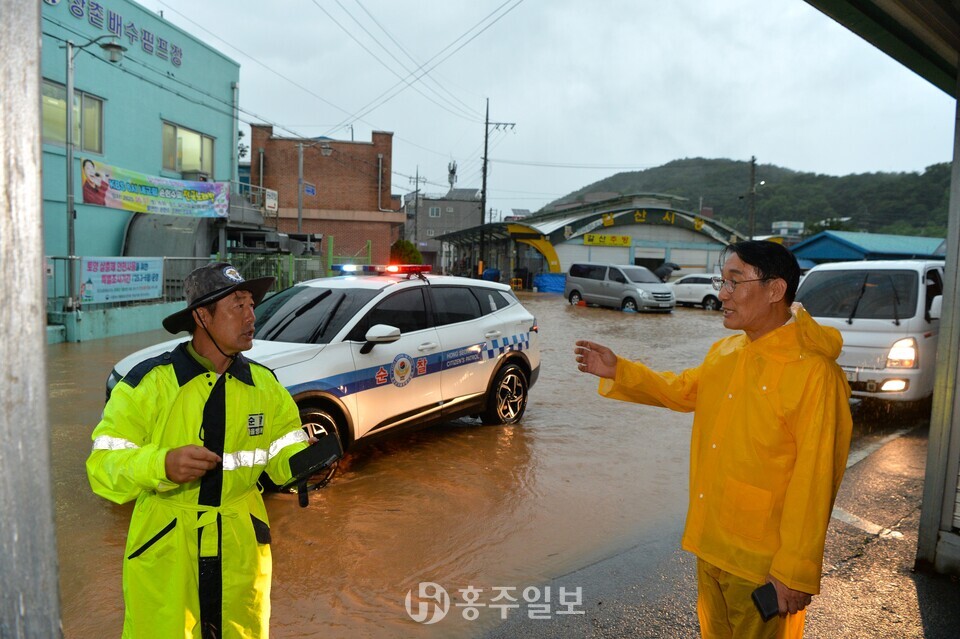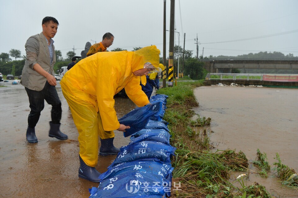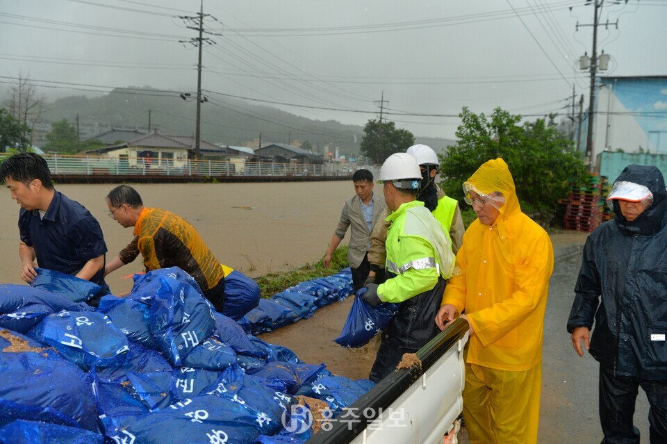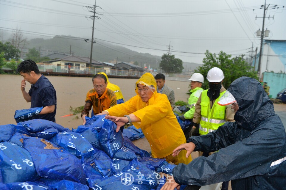 [홍주일보 홍성=한기원 기자] 이용록 홍성군수가 17일 갈산교 범람으로 침수 피해를 입은 갈산전통시장 일원에서 주민·갈산면 직원들과 함께 모래주머니를 활용한 긴급 복구 작업에 나섰다.