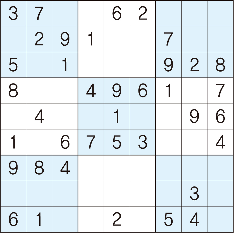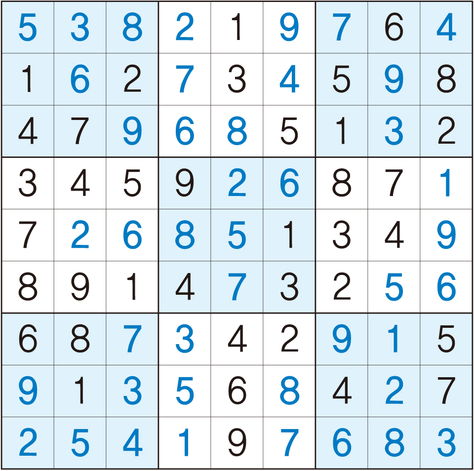 3. 큰 정사각형(9x9) 안에 있는 작은 정사각형(3x3) 안에는 숫자 1~9가 각 한 번씩 들어간다.